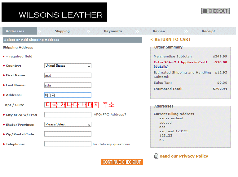 하지만 워낙 한국에서 직접구매를 많이들 하시니까 빌링 주소에 한국을 추가 했습니다.