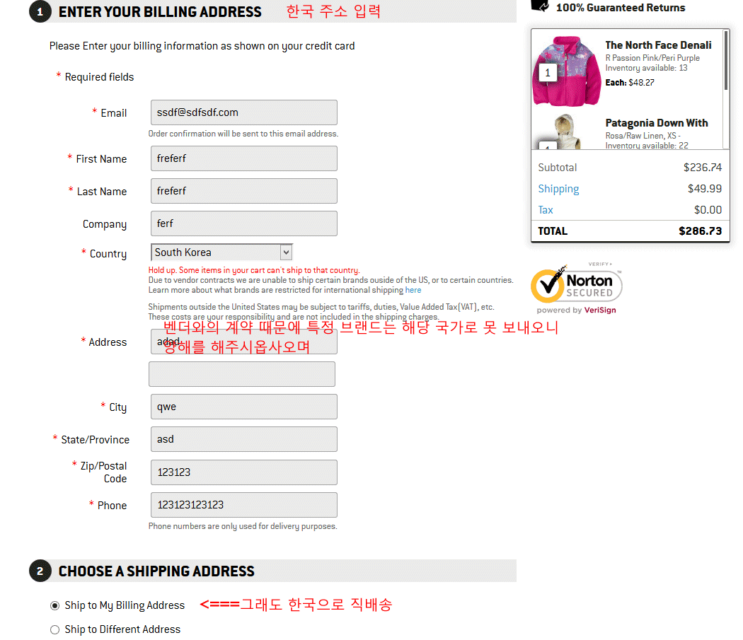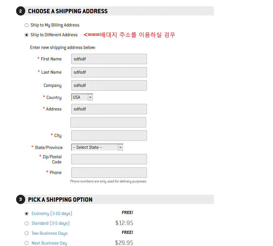 즉 빌링 어드레스는 한국으로, 쉬핑 어드레스만 미국으로 하시는 것이죠.