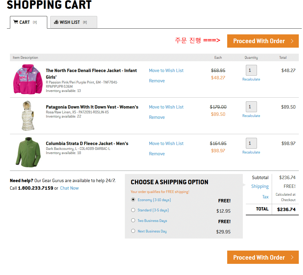 제품을 장바구니에 담고 Proceed with order 버튼을 클릭하셔서 주문을 진행합니다.