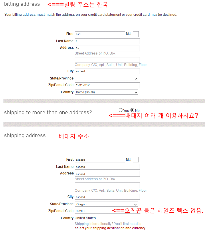 배송대행을 이용하셔서 직구 하실때는 빌링 주소는 한국으로, 쉬핑 주소는 이용하시는 배송대행 업체 주소를 지정하세요.