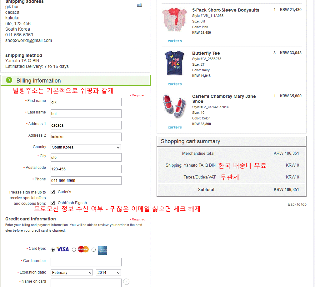 친절하게 한국어로 한국 직배송 안내를 합니다. 더구나 10만원 이상이면 한국까지 무료 배송이며 10만원대는 관세도 없으니까 아이들 옷 , 신발 구매하게에 적절합니다.