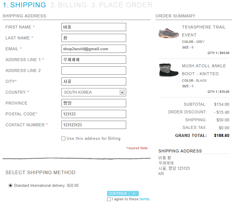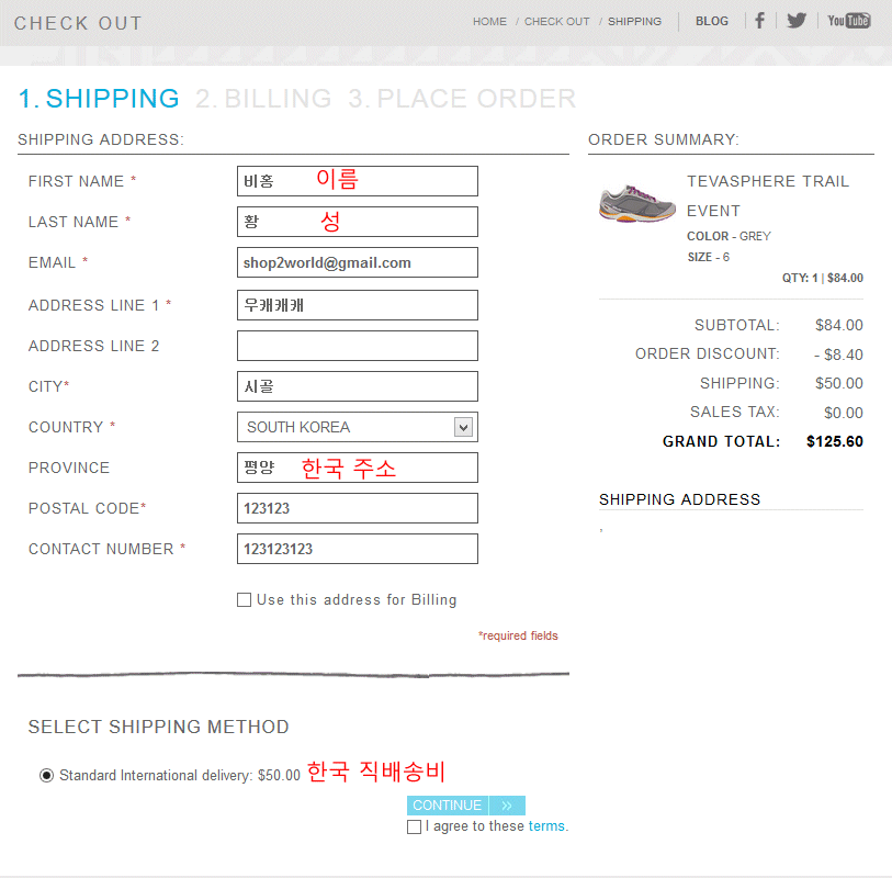 한국을 배송주소로 해서 진행합니다. 배송비가 50불이 나오는군요.