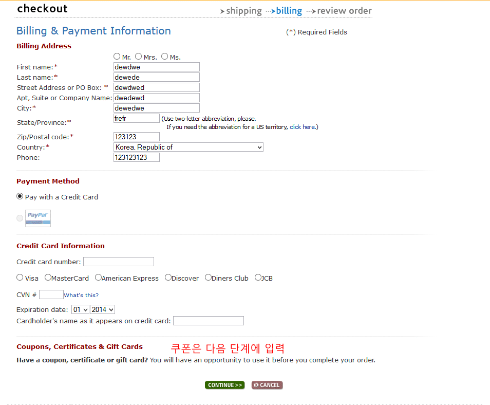 그리고 다음단계에서 신용카드 정보를 입력하시고, 또 한번 다음 단계에 가시면 할인 쿠폰도 적용하신 후 최종 금액 확인 후 주문 진행을 하실 수 있습니다.
