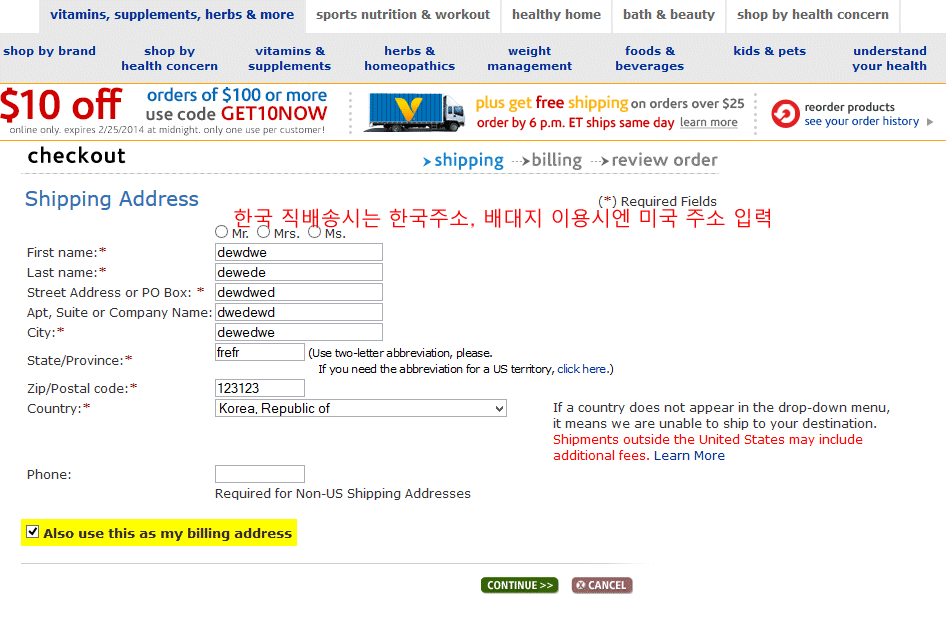 비타민 샵은 한국 직배송도 되고, 미국내 배송대행 업체를 경유하셔도 됩니다.