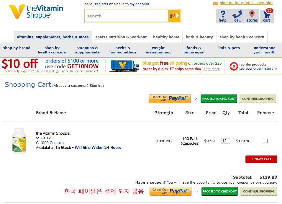 비타민샵은 페이팔 결제가 미국내 페이팔만 됩니다. (한국에서 만들면 변팔)