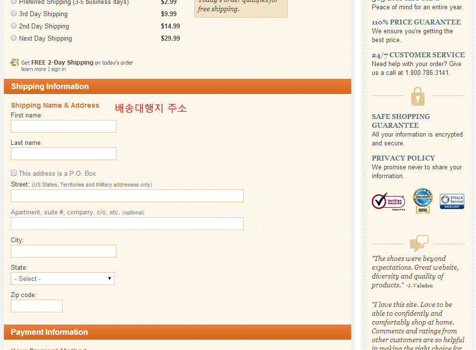 그리고 빌링어드레스와 쉬핑어드레스 모두 배송대행 업체 주소를 입력합니다.
