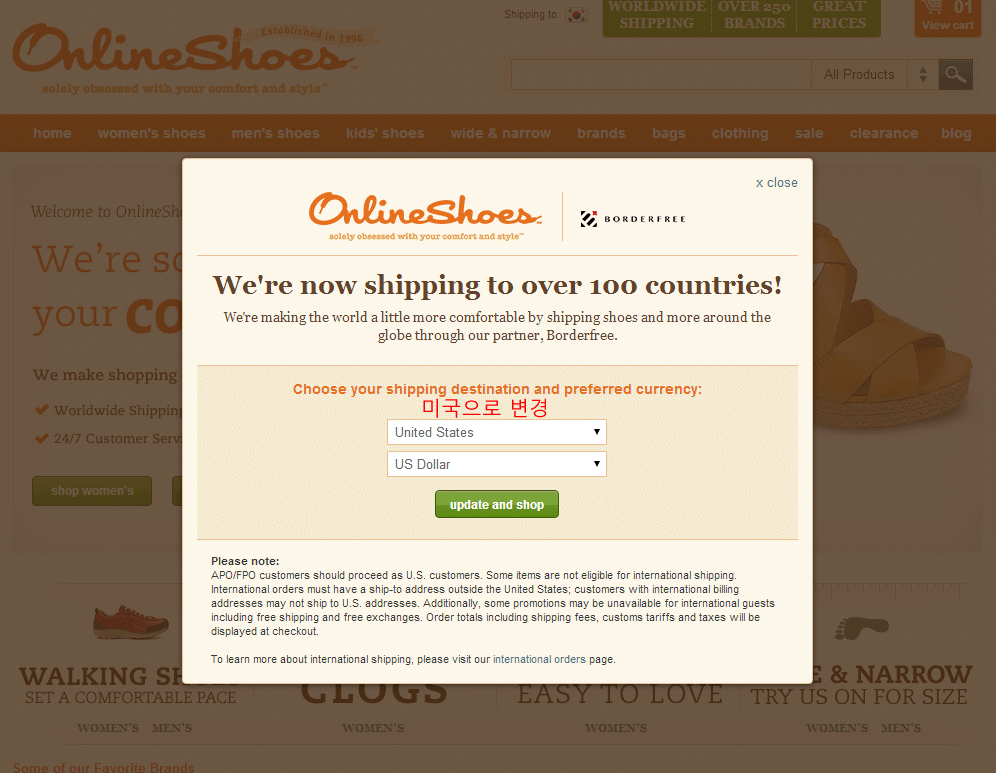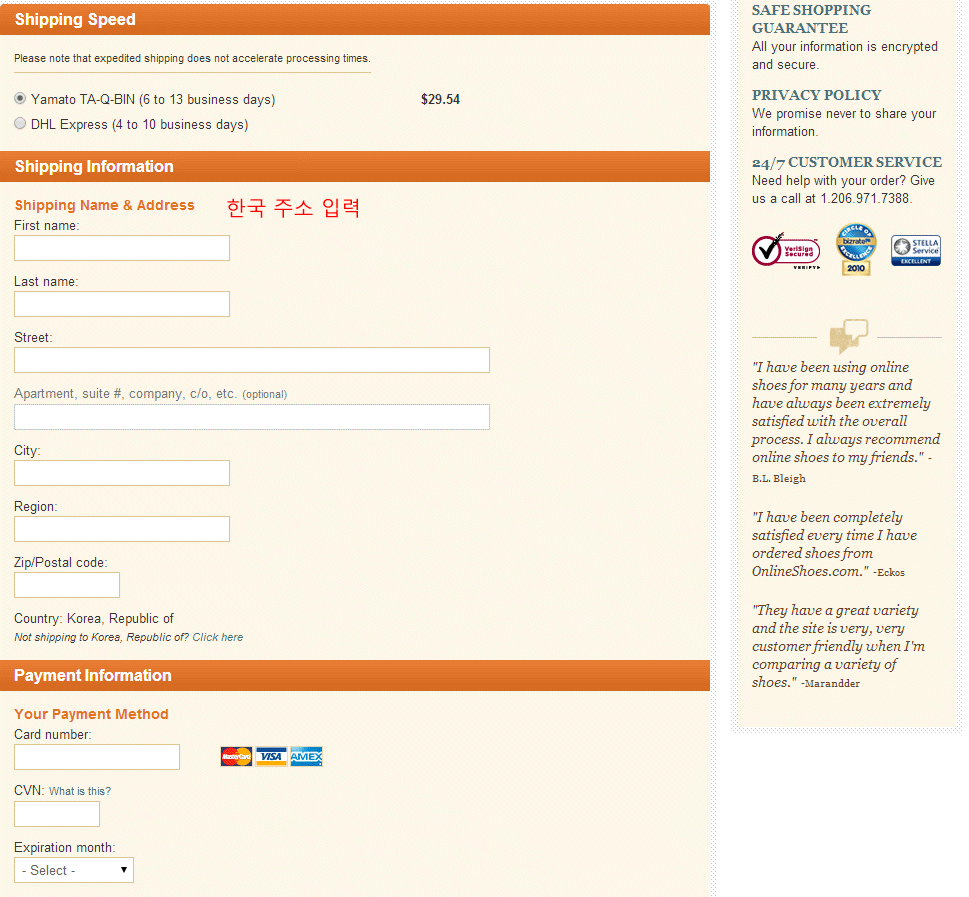 그러나 온라인 슈즈는 이렇게 미국 주소로 결제하실 경우 간혹 한국 카드 승인이 튕기기도 합니다.