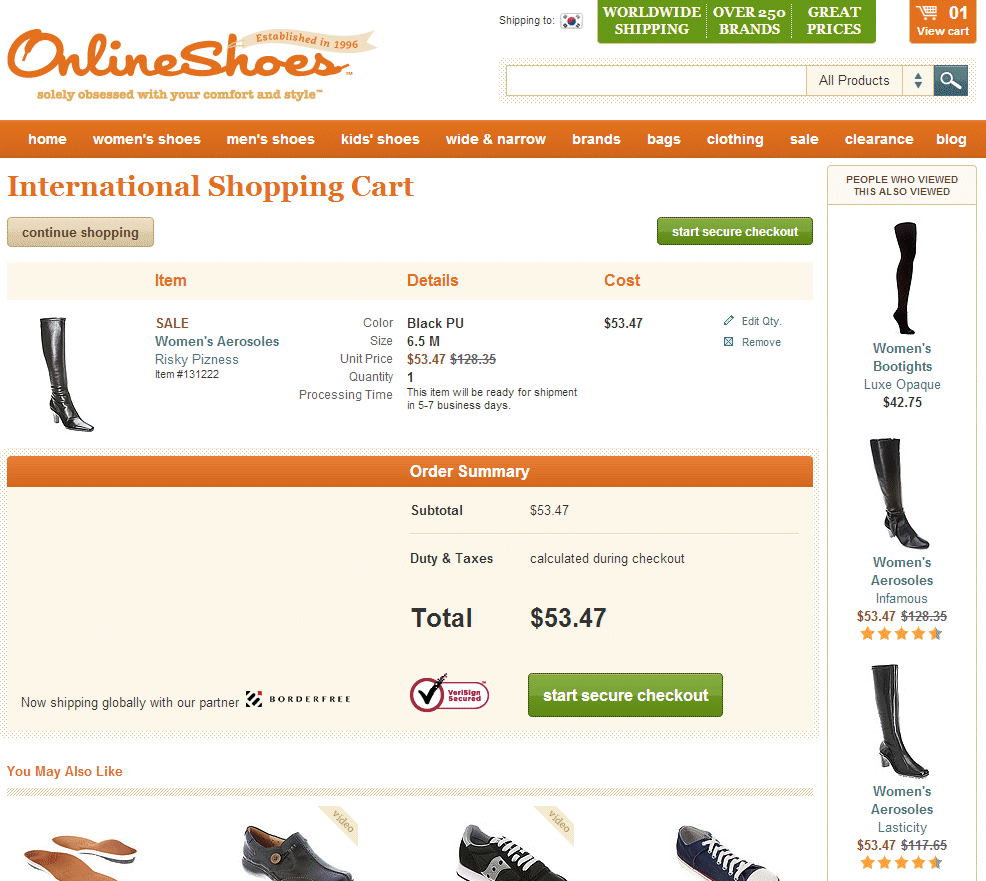 체크아웃을 진행합니다. 관세와 부가세는 체크아웃과정에서 계산됩니다.