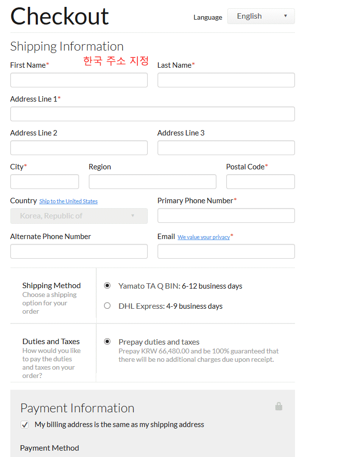 이것을 한국어로 번역하면 다음과 같습니다. ==> 빌링 주소지에 배대지 주소를 넣는 드럭공법을 이용하세요.