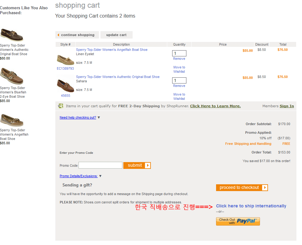 슈즈닷컴은 한국 직배송도 됩니다. 여기서는 한국 직배송을 이용한 직접 구매와 미국 배송대행 서비스를 이용한 구매의 두가지 경우로 살펴 봅니다.