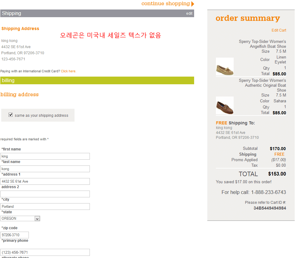 참고로 슈즈닷컴을 미국내 배송대행 업체를 이용하셔서 주문하실 경우에는 오레곤을 이용하시면 미국내 세금이 없습니다.