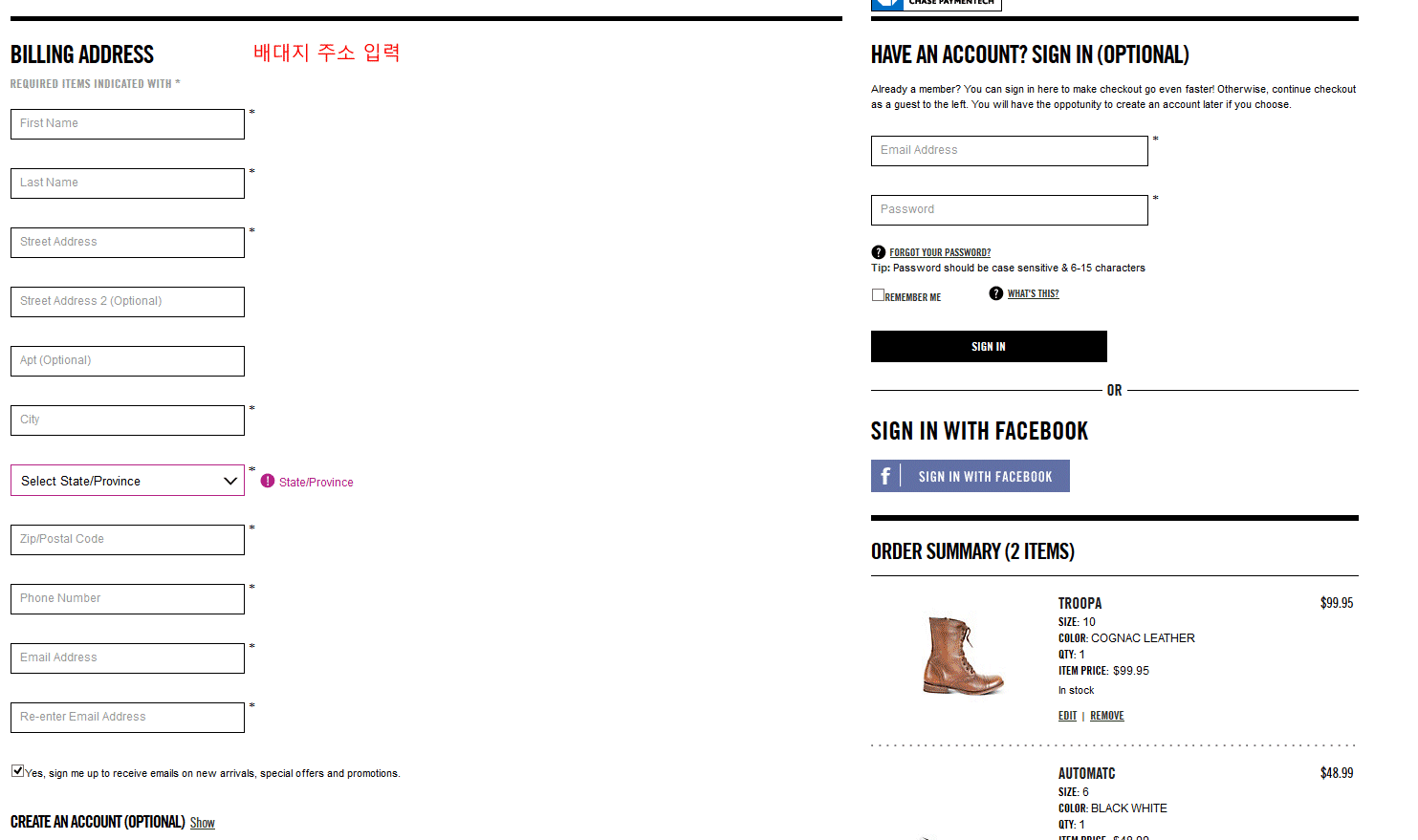 스티브매든의 결제는 드럭공법으로 합니다. 빌링주소와 쉬핑 주소를 모두 이용하시는 배대지 주소를 넣은 것이죠.
