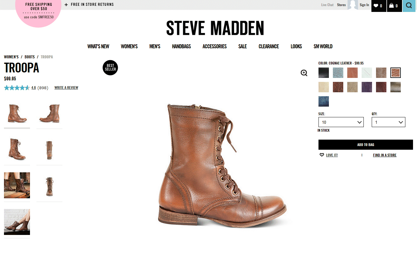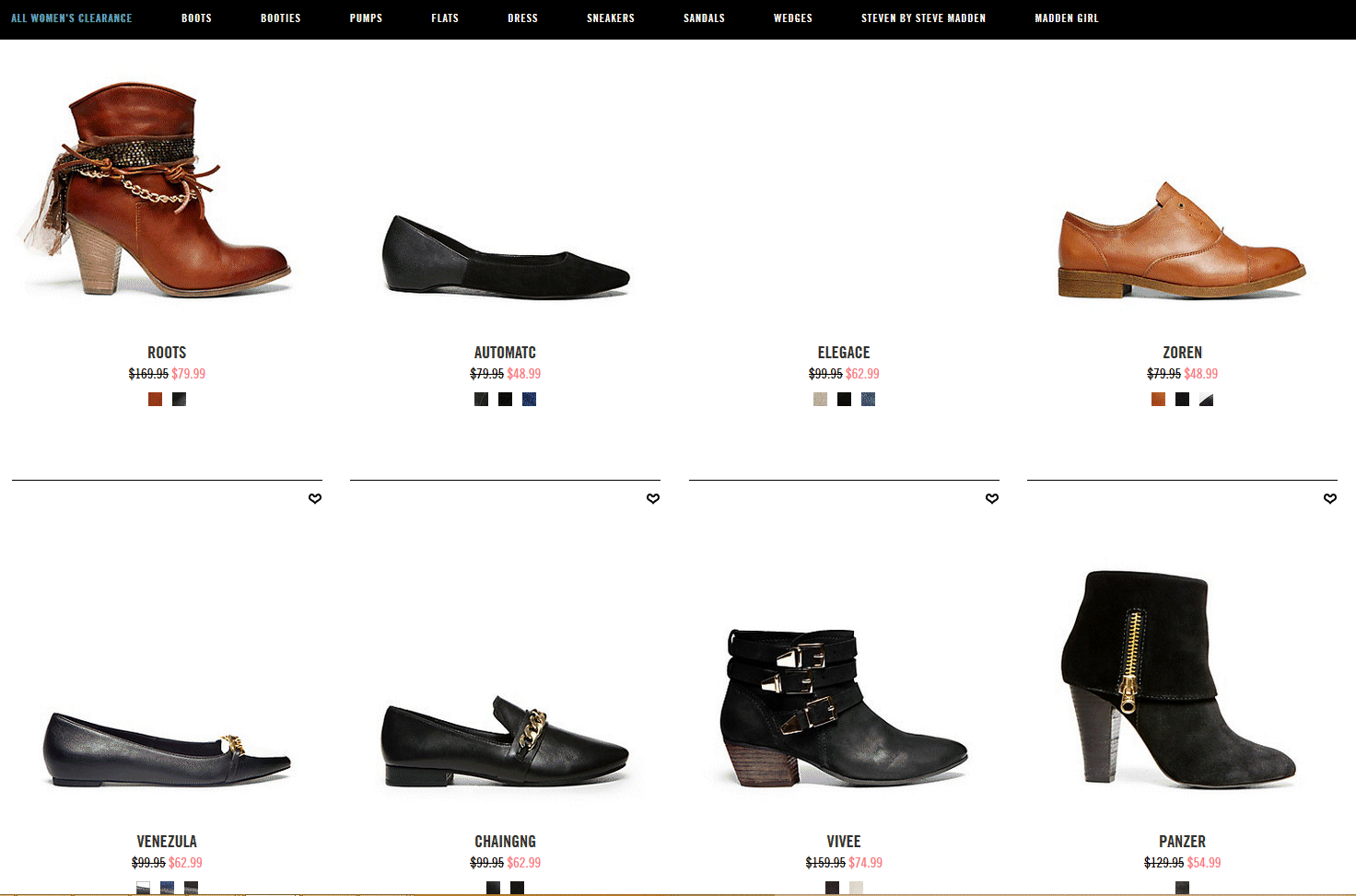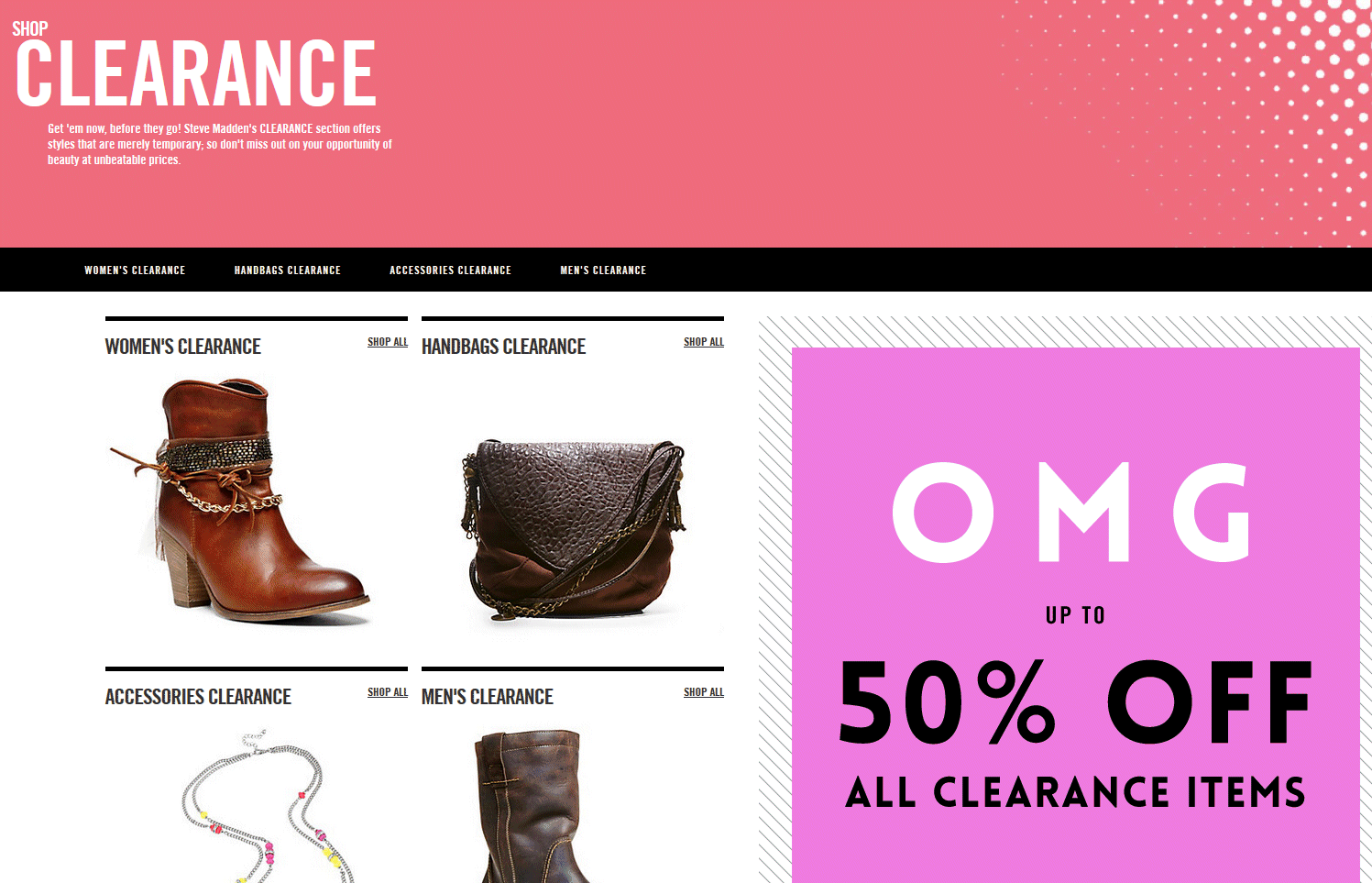 또 스티브 매든은 상설 클리어런스 섹션을 유지합니다. 여기에 가시면 저렴한 제품들이 있습니다.