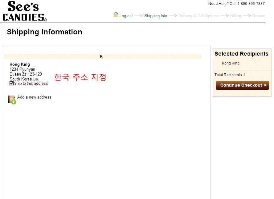이렇게 한국 배송지가 지정되었습니다.