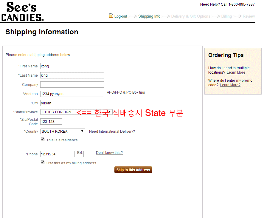 직배송시에는 다음과 같이 주소를 넣습니다. 항상 라스트네임이 성이라는 건 환상의 “랄랄라 성”을 기억하시면 되구요, State 부분은 한국 직배송시에는 아래 그림처럼 넣으세요.