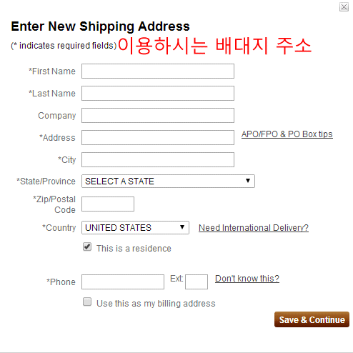 미국 배송대행지 이용하실 경우에는 빌링 어드레스는 한국 주소, 쉬핑 주소만 배송대행 업체 주소를 적으시면 됩니다.