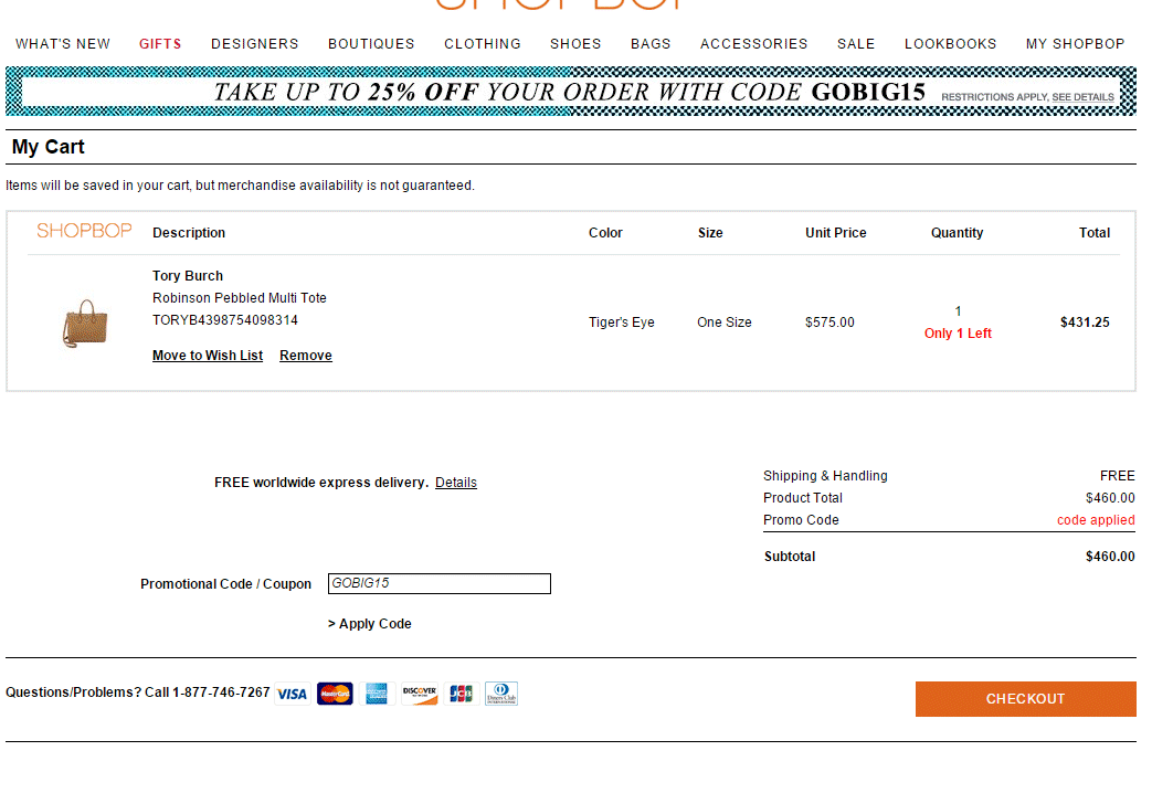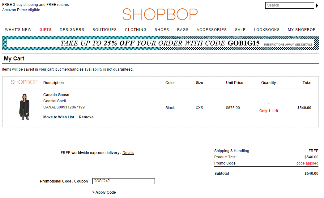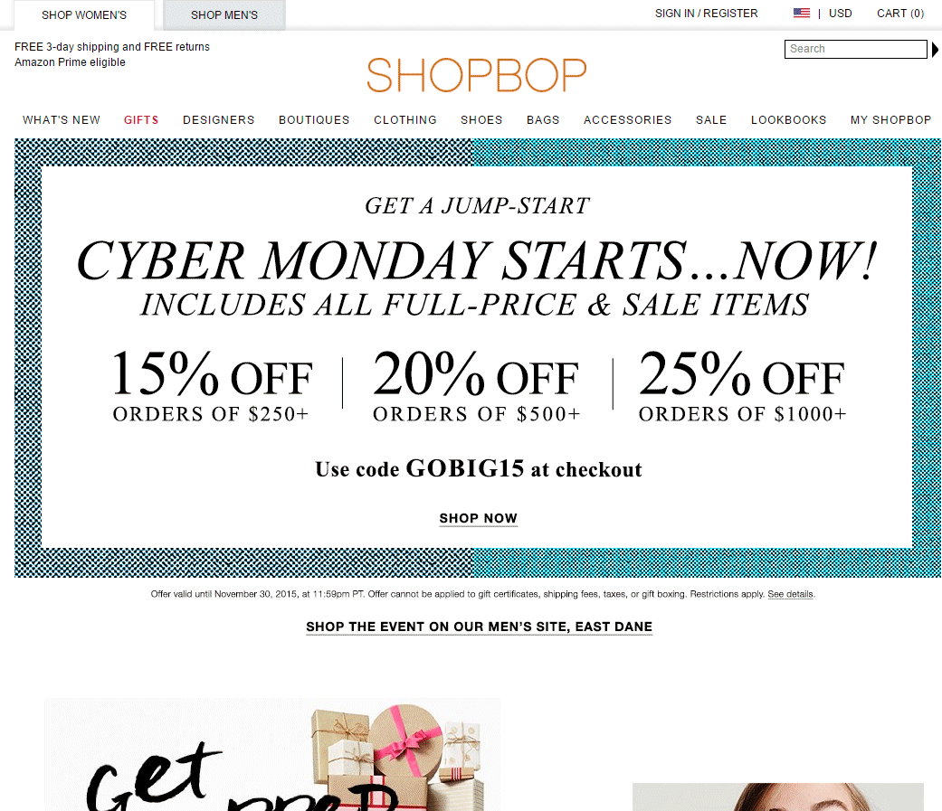Shopbop.com Cyber Monday Sale. 15% off $250 + , 20% off $500 + , 25% off $1000 + use code GOBIG15 Ends.11/30