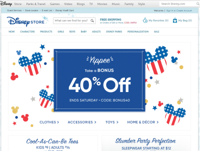 Disney Store : Yippee! Bonus 40% Off Coupon Code: BONUS40 Ends.2/18