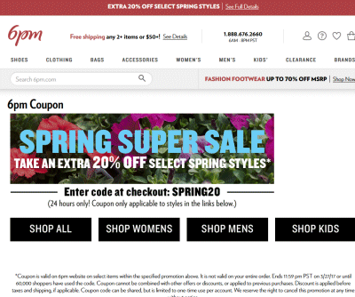Our Spring Super Sale is here! Take an extra 20% off select spring styles! Coupon Code: SPRING20 Ends.3/27