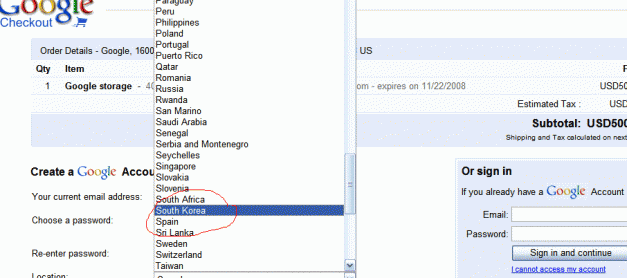 구글 체크아웃 계정을 만드는 방법입니다. 인터넷 주소는 다음과 같습니다. http://www.google.com/checkout 1. 원하시는 해외쇼핑몰에서 구매를 하신 후 결재 과정에서 google checkout을 클릭하십니다. 그리고 계정을 만드십니다. 그냥 이메일등의 정보와 국가등의 주소를 선택합니다. * 여기 그림은 빌링에 한국이 있는 판매자라 한국이 나옵니다. 그러나 현재 대부분 구글체크 아웃 결재에는 한국이 없으므로 미국 쇼핑 구글체크아웃 결재시에는 드럭공법식으로 이용들을 하십니다. 2. 이메일, 구글체크아웃비밀번호 ,주소, 신용카드 정보등을 입력하면 모든게 끝~ 이메일은 한국의 네이버나, 다음 이메일로도 구글체크아웃 계정이 만들어 지지만 구글 지메일(gmail.com)이용을 추천합니다. …