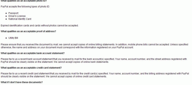 페이팔 이용 중 어카운트 리미테이션 ( Account Limitation) 의 경우 해결책을 살펴봅니다. 돈을 보내지도 받지도 못하는 불편한 상태죠. 이때 해결을 위해 팩스로 원하는 것으로 페이팔은 다음과 같은 서류를 요청합니다. 페이팔에서 요구하는 내용의 핵심은 본인이며, 해당 주소에 실재 거주하는지를 증명할 서류입니다. 따라서 페이팔의 본인 인증 과정에서 가입하신 페이팔의 정보와 일치함을 증명하면 됩니다. 페이팔 계정의 이름과 동일인이며, 페이팔에 등록한 주소에 실재 거주하는지를 확인합니다 이것을 증명하기 위해서 다음의 서류를 제출하셔야 합니다. 이런 서류 증명의 핵심은 앞서 말씀드린 것 …