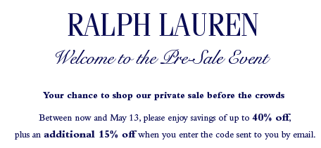 Polo Ralph Lauren 의 40% 프리세일이 시작되엇습니다. 5월 13일 까지입니다. 초대에 의한 비공개 세일이므로 그냥 들어가시면 안보이고 polo.com/mvc 로 들어가셔서 보시면 40% 까지 할인된 제품이 나옵니다. 그리고 최고 40%할인된 가격에서 추가 로 15% 할인되는 쿠폰은 여러분 이메일로 보내졋습니다. 만약 기존에 폴로 랄프 로렌에서 구매하셧는데 이메일 못받은 분은 토사구땡 당하신겁니다. 그럴 경우에는 임의로 다음처럼 쿠폰을 만들어 보세요. 할인 코드는 PRES+7자리임의의 숫자 이며 PRES9563658 이런 형식입니다. 그러나 숫자 찾기가 힘드는 군요. 하지만 난수로 계속 하시면 찾으시더라구요~ 그외 아래는 …