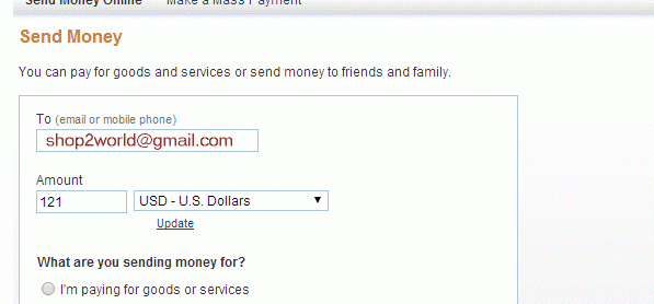 구매대행 (배송대행) 결제에 대해 말씀드리겠습니다. 신용카드 결제는 다음의 링크에서 하시면 됩니다. 신용카드 결제 하기 무통장입금은 샵투월드 오늘의 환율로 변환 후 (참고: 오늘의 환율 http://www.shop2world.com/customerservice_currency.html) 받으신 입금계좌로 입금해주시면 됩니다. 페이팔 결제는 페이팔 (www.paypal.com) 을 통해 shop2world@gmail.com 을 수신인으로 Send Money 에서 I’m sending money to family or friends 항목으로 보내주시면 됩니다.(그림 참고) 관련: 페이팔 이용 방법 안내