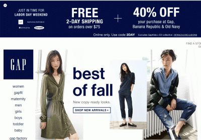 갭라인입니다. 노동절 기념 세일 입니다. 주말 40% 할인 됩니다. 쿠폰은 WEEKEND 갭 Gap.com. Just in time for Labor Day weekend! 40% off your purchase at Old Navy, Gap & Banana Republic. Use code WEEKEND. Ends 8/31. Restrictions apply. 올드네이비 Oldnavy.com : Starting 8/30: Online only. Just in time for Labor Day weekend! 40% off your purchase at Old Navy, Gap & Banana Republic. Use code WEEKEND. Ends 8/31. Restrictions apply. 바나나 인민공화국 bananarepublic.com Starting 8/30: …