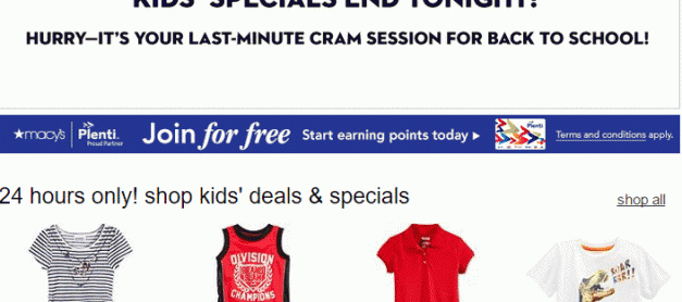 메이시 백화점입니다. 학교에 가서 놀라고 백투스쿨 세일 합니다. Macys.com $5.99불 부터 여아용 카터스, 타미 힐피거 세일하고, 신발은 20%까지 등 세일합니다. Receive 20% off at Macy’s Back to School Sale. Use code BTS at checkout. Offer valid 8/9-8/13 •Online Exclusive 24 hours only! Kids Back to School Specials starting at $5.99 at macys.com. Valid 8/12 Macy’s Hot Products: • 24 HOURS ONLY! Select Girls Clearance $5.99-12.99 from Carter’s, Tommy Hilfiger and more at macys.com. Valid …