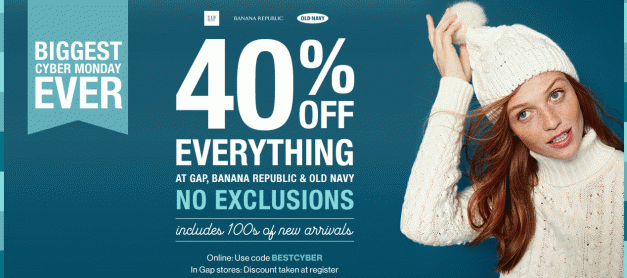 갭의 사이버 먼데이 세일이 시작되었습니다. 40% 할인 쿠폰은 BESTCYBER 입니다. Gap.com : Biggest Cyber Monday Ever. 40% off everything (no exclusions) at Gap. Use code BESTCYBER. Restrictions Apply. Ends 11/30. 관련 :미국 갭(Gap.com) 한국에서 직구하기
